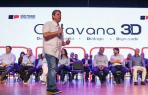 Em tratamento contra um linfoma, o deputado estadual Valdomiro Lopes (PSB) foi homenageado com aplausos e palavras de encorajamento durante o evento da Caravana 3D, realizado nesta quinta-feira (23) no Complexo Swift, em São José do Rio Preto. O governador Tarcísio destacou a fé e a resiliência do parlamentar ao citar um trecho bíblico do livro de Romanos (12:12): “Alegrem-se na esperança, sejam pacientes na tribulação e perseverem na oração.” Segundo Tarcísio, Valdomiro “está passando por um momento difícil, mas a vitória virá”. Valdomiro foi aplaudido de pé por prefeitos e lideranças políticas da região. Clique aqui para assistir a entrevista com Valdomiro.