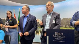 O agropecuarista e ex-ministro da Agricultura Antônio Cabrera Mano Filho esteve nesta terça-feira (20) no gabinete do prefeito de São José do Rio Preto, Coronel Fábio Cândido, para uma entrega simbólica com forte valor social e espiritual: uma Bíblia em braile. A doação foi realizada em nome da Sociedade Bíblica do Brasil (SBB) e marca um momento inédito para a cidade, que ainda não dispunha de uma versão física da Bíblia voltada à população com deficiência visual. O ato no gabinete municipal ocorre como parte da programação do projeto nacional “Mais de 31 mil vozes com a Palavra”, que chegou a Rio Preto no último domingo, 18 de maio, com o estúdio móvel da Rádio Bíblia SBB estacionado na cidade até o dia 24. Durante a semana, moradores estão convidados a participar da gravação de versículos bíblicos, que comporão uma versão em áudio da Bíblia com sotaques e vozes de todas as regiões do Brasil.