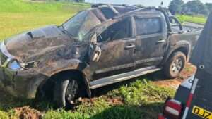 Após o impacto, a caminhonete saiu da pista, subiu em um barranco e capotou. O Cobalt rodou na pista e permaneceu na faixa contrária.