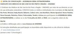 O Sindicato dos Médicos de São José do Rio Preto e Região (SINDMED) convocou seus associados para uma Assembleia Geral Extraordinária no próximo dia 15 de julho de 2025, às 9h, com foco na análise e deliberação do novo estatuto da entidade.