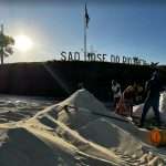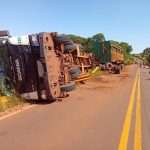 Um caminhão carregado com açúcar ensacado tombou na rodovia Deputado Leônidas Pacheco Ferreira, em Novo Horizonte, na manhã desta quinta-feira,